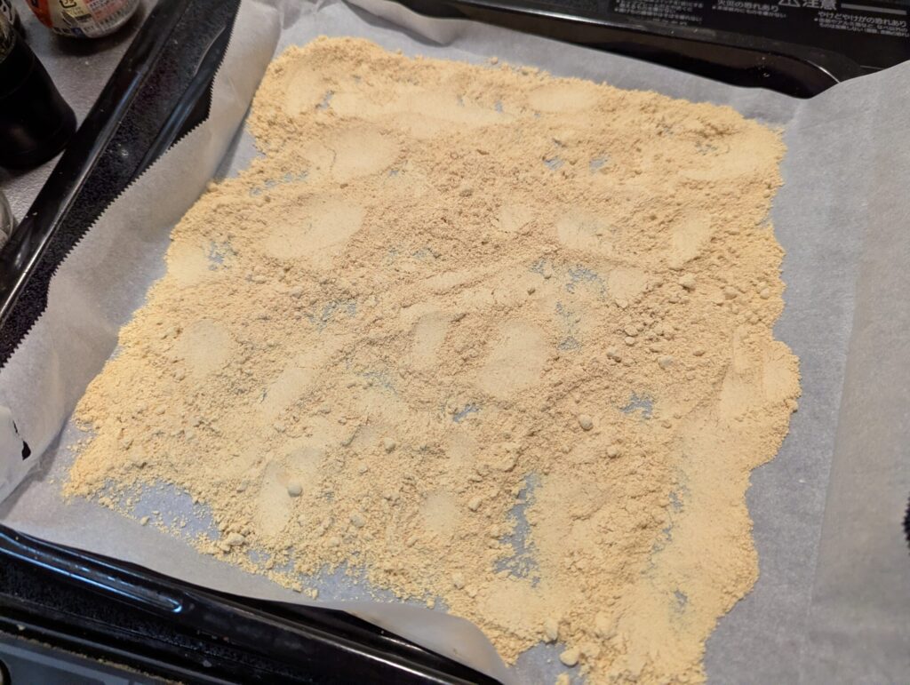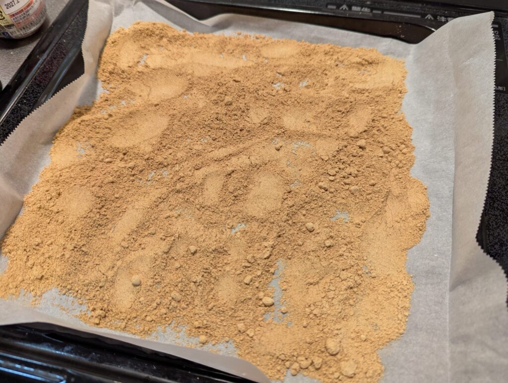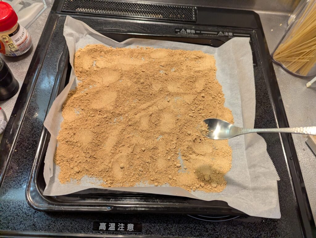 - 耐熱皿やオーブンプレートにクッキングシートを敷いて、しょうがパウダーを薄く広げる