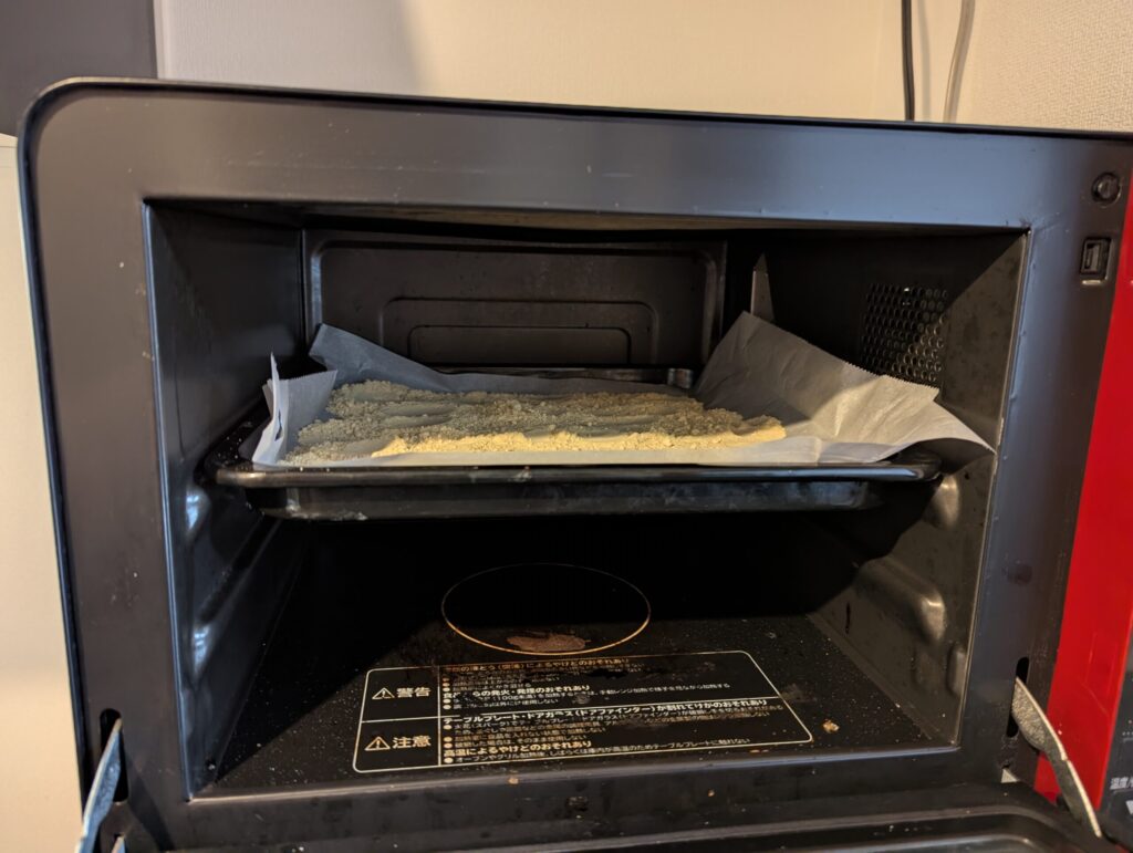 ※温風が出るタイプのオーブンの場合は、粉が舞わないように蓋ができる耐熱容器等を使う - 130℃に予熱したオーブンで30分加熱