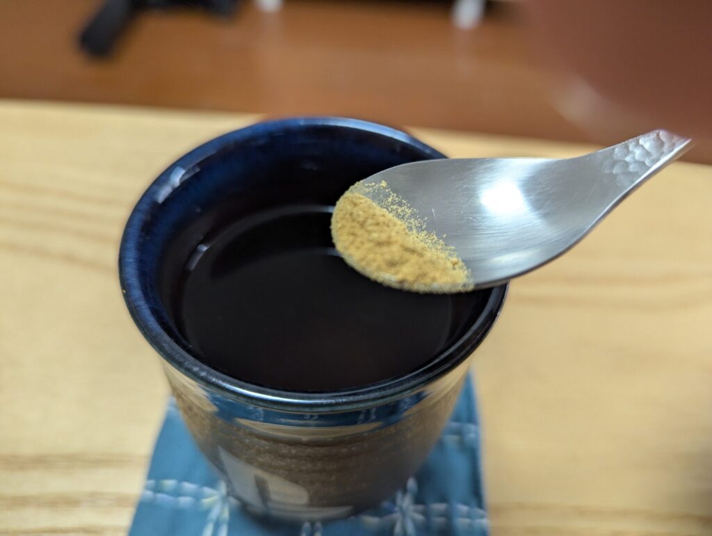 コーヒー、紅茶、ルイボスティー、ほうじ茶などに、ティースプーンの先にほんの少しだけ乗せたパウダーを溶かし、飲んでいきます。ただこのパウダー、ちょっと水分に溶けにくいのか、飲み物に入れてすぐに飲むと粉っぽさを感じます。しっかり溶かしつつ、飲んでいる最中もたまにかき混ぜながら飲むのがよいと思います。